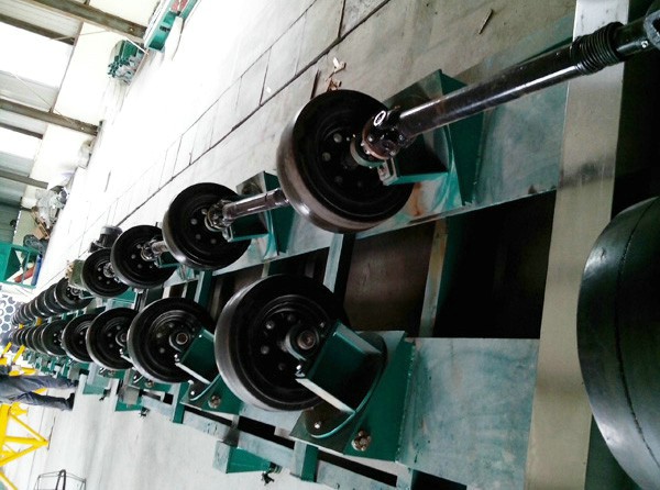 傳動(dòng)線解決中大型管道進(jìn)行內(nèi)、外防腐作業(yè)時(shí)管子的進(jìn)給問(wèn)題。它包括主動(dòng)輪組件、從動(dòng)輪組件、回轉(zhuǎn)盤(pán)、滑座、中心距調(diào)節(jié)機(jī)構(gòu)、中心距鎖止機(jī)構(gòu)、螺旋角調(diào)節(jié)機(jī)構(gòu)和螺旋角鎖止機(jī)構(gòu),所述主動(dòng)輪組件和從動(dòng)輪組件分別固定在對(duì)應(yīng)的回轉(zhuǎn)盤(pán)上,所述回轉(zhuǎn)盤(pán)安裝在滑座上,所述滑座與中心距調(diào)節(jié)機(jī)構(gòu)及中心距鎖止機(jī)構(gòu)配裝,所述螺旋角調(diào)節(jié)機(jī)構(gòu)與回轉(zhuǎn)盤(pán)配裝,所述螺旋角鎖止機(jī)構(gòu)安裝在滑座上,它與螺旋角調(diào)節(jié)機(jī)構(gòu)匹配。本實(shí)用新型不僅可降低操作人員的勞動(dòng)強(qiáng)度、提高工作效率,而且能保證管道螺旋傳動(dòng)線上各輪組之間參數(shù)的一致性。